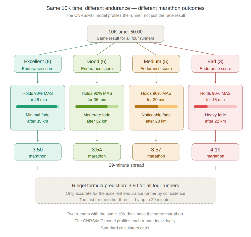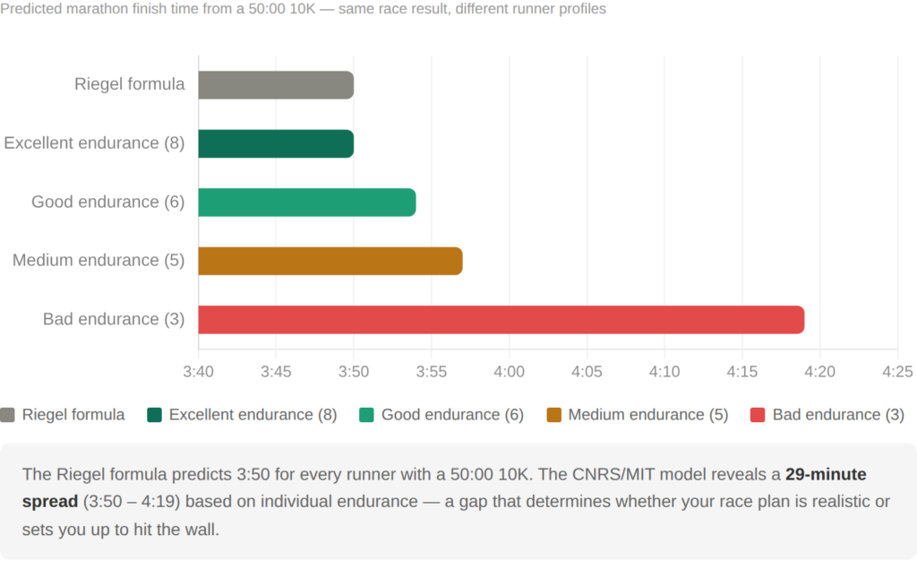 Notice how the Riegel formula produces a single marathon prediction of 3:50 regardless of the runner’s endurance profile. The RunMotion model shows a range from 3:50 to 4:19 depending on individual endurance capacity. Accounting for this 29-minute spread could be the difference between hitting a goal and hitting the wall. For most recreational runners, the Riegel prediction of 3:50 is unrealistically fast, which is exactly what the Vickers and Vertosick research confirmed.
